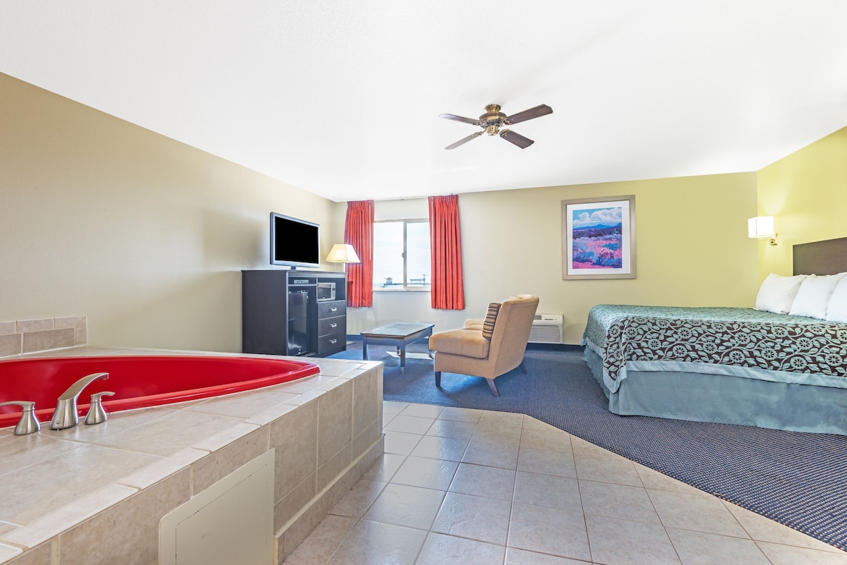 Welcoming hotel offering in‑room heart‑shaped Jacuzzi, pool and pet‑friendly rooms, with convenient access to I‑35.