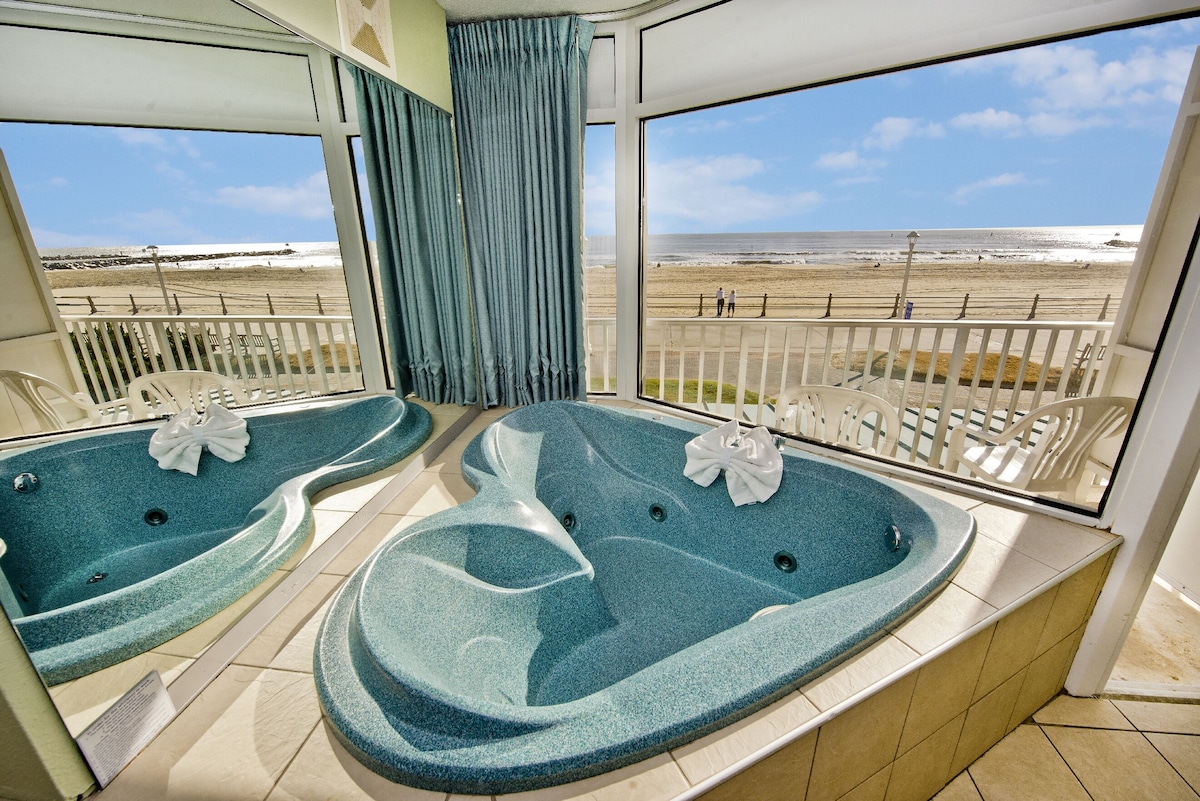 Ocean view hotel with private heart‑shaped Jacuzzi, pool and free parking, 2‑minute walk from Grommet Island Park.